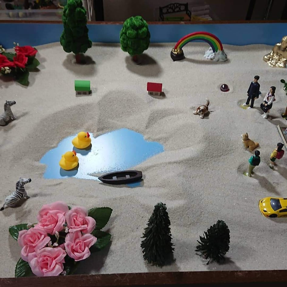 砂に触ることで退行し、子どもの心に戻り、癒やす。大人として持っている、こだわり、偏見を忘れ、無になる。そもそも遊戯療法。子どもの時に、砂遊び、おもちゃ遊びを思い起こし、思いつくままにパーツを置くことで、出来た世界が自分の世界。